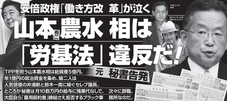 こんな農林水産大臣・山本有二でありますが、週刊文春によると今度は「労働基準法違反」も犯してくれちゃっているらしい。