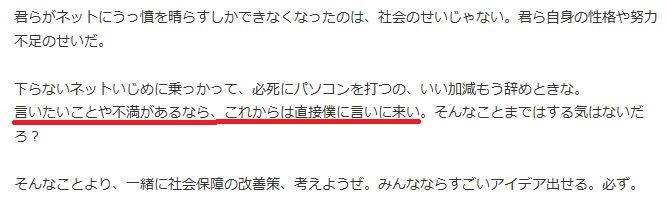 ちなみに一緒に社会保障の改善策考えようぜと世迷い言を並べていますが、病人を抹殺する以外に何も浮かばなかった人間の発言だと思えば爆笑できます。