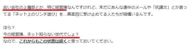 他にもスポンサーに対しては「言うまでもなく、そんな連中はもともと顧客じゃありません。無視しておけばいいことくらい、若い人たちにはすぐに理解できる」と、そこらへんのスマホポチポチしてるだけのアホな若者たちよりスポンサーのお偉いさんは知能や社会経験が劣るとでも言いたげではありませんか。あな恐ろしや。